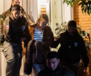 Esposada con sus manos ocultas por una manta y detenida salió a las 23.05 horas desde su domicilio a la 47 comisaría de Las Condes, la exministra de la Corte Suprema Angela Vivanco. Ahi pasó la noche antes de su formalización