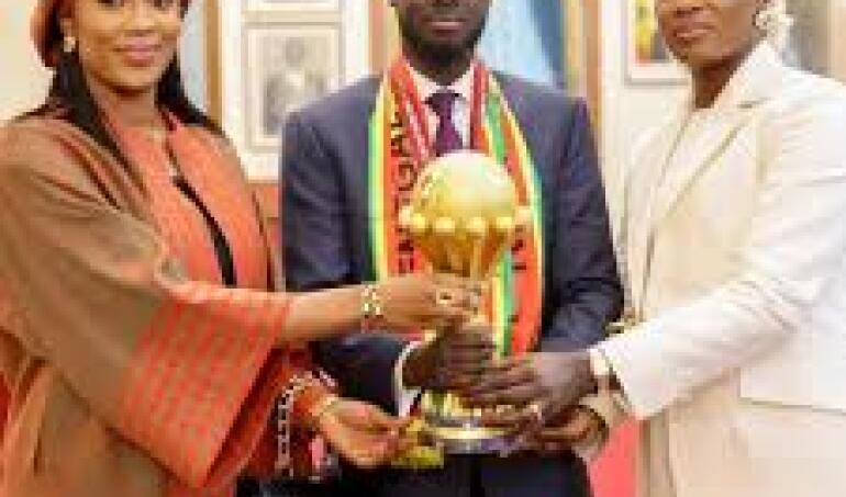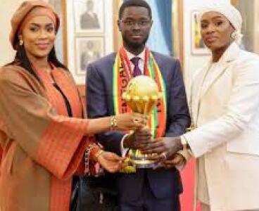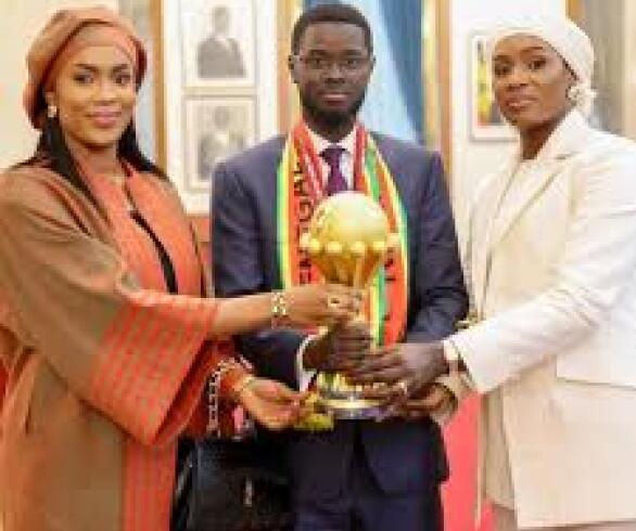 La fotografía oficial del festejo sorprendió fuera de África: el mandatario posó con el trofeo junto a Marie Khone Faye y Absa Faye, sus dos esposas, en un acto de Estado de alto perfil.