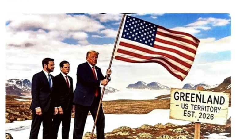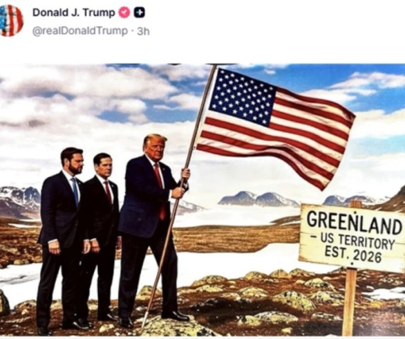 En la foto, el mandatario aparece acompañado por el vicepresidente estadounidense, JD Vance, y el secretario de Estado, Marco Rubio, y se ve un cartel que dice “GROENLANDIA – TERRITORIO DE ESTADOS UNIDOS EST. 2026”.