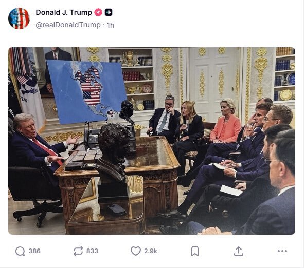 En la primera imagen publicada por Trump en su cuenta de Truth Social aparece el magnate en el Despacho Oval de la Casa Blanca ante líderes europeos, a quienes supuestamente les está presentando un mapa en el que se muestra a Groenlandia, Venezuela y Canadá como parte del territorio de Estados Unidos.