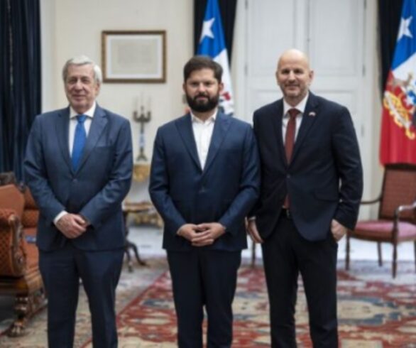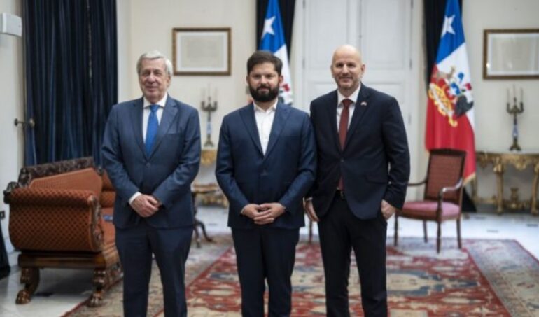 El Presidente Gabriel Boric recibió en La Moneda al embajador de Estados Unidos en Chile, Brandon Judd, en la imagen junto al canciller Van Klaveren, quien hizo entrega de sus cartas credenciales´luego de ásperos cruces de palabras.