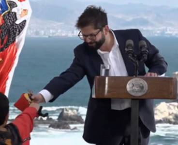 Ver Video. El momento en que niño le regaló un juguete de "Thor" a Boric en pleno discurso
