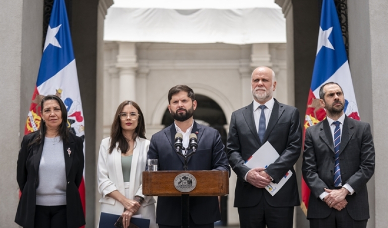 Foto: Ministras/os Macarena Lobos, Camila Vallejo, el Presidente Boric, Alvaro Elizalde y Nicolás Grau