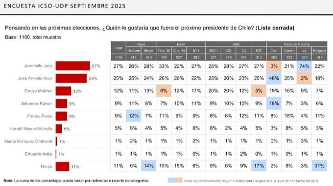 Jeannette Jara: 27% (+2) Josè A. Kast: 25% (-8) Evelyn Matthei: 12% (-1) Johannes Kaiser: 9% (+3) Franco Parisi: 9% (+3) Harold Maynne Nichols: 5% (+3) ME-O: 1% (=) Eduardo Artés: 1% No sé: 11% (-2)