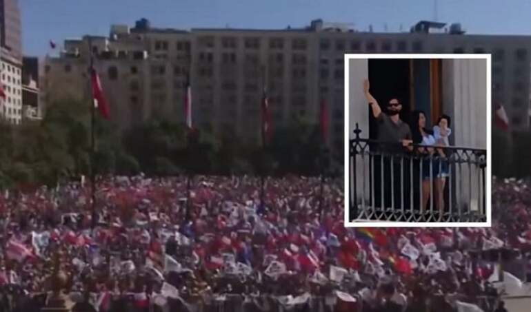 En compañía de su familia, el Presidente Boric saludó desde uno de los balcones a adherentes que arribaron a La Moneda en acto de despedida