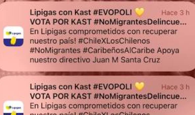 La empresa Lipigas reaccionó al mensaje que recibieron algunos usuarios de su aplicación LipiApp y que llamaba a votar en favor de José Antonio Kast, como se ve en la imagen.