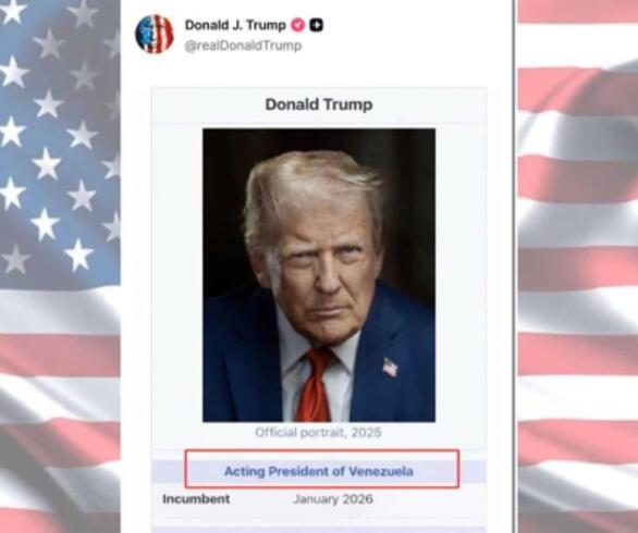 El presidente de Estados Unidos, Donald Trump, publicó una imagen en su red social de su propiedad Truth Social en la que afirma ser el "presidente interino de Venezuela". No se sabe si es una broma o es una de las nuevas locuras del mandatario de EEUU.